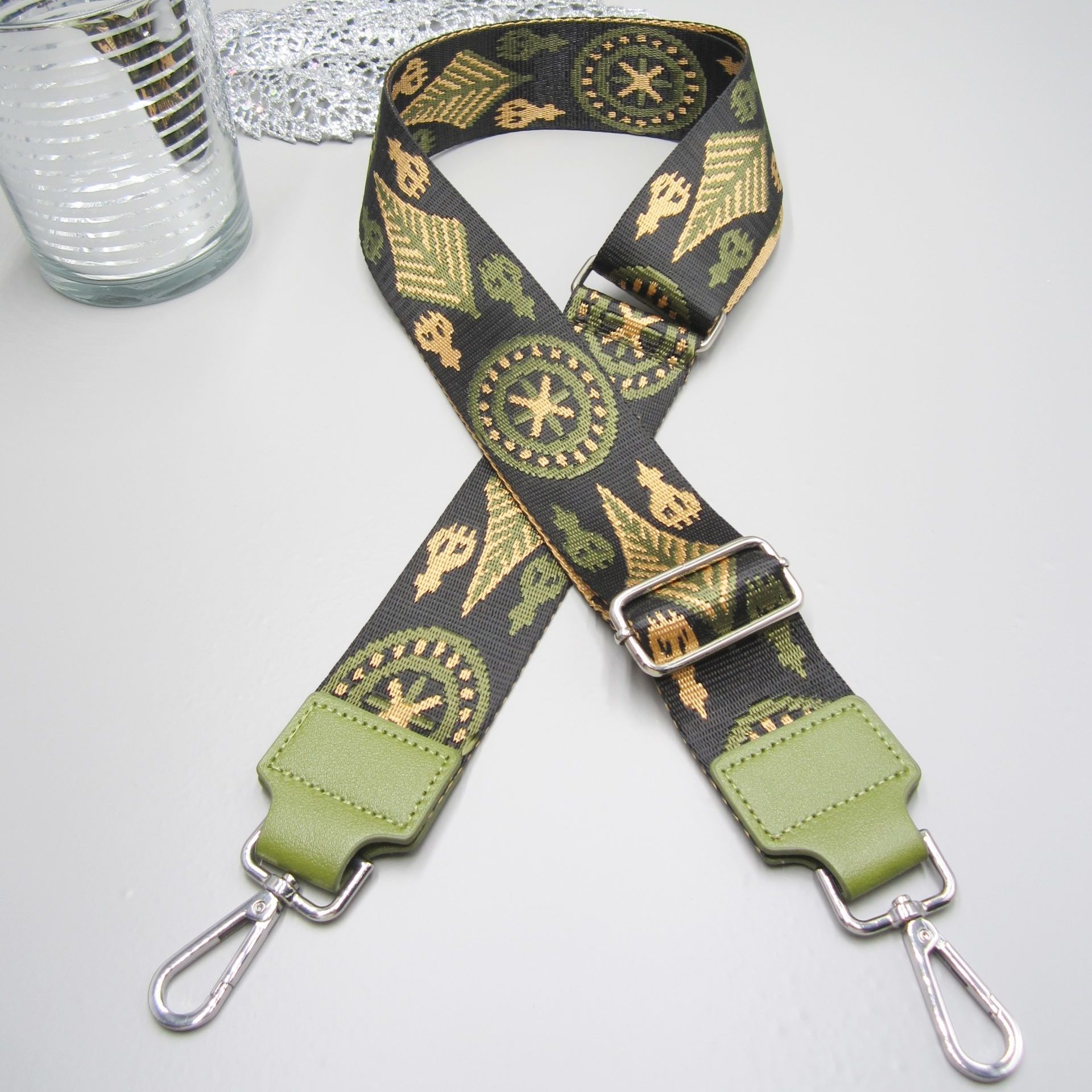 Der Taschengurt mit einem verspielten Design ist das perfekte Accessoire, um deiner Handtasche oder Bauchtasche einen eleganten Look zu verleihen. Mit hellen oliv-grün und schwarz gold im Design ist dieser Gurt ein echter Hingucker und bringt sofort gute Laune in jedes Outfit.