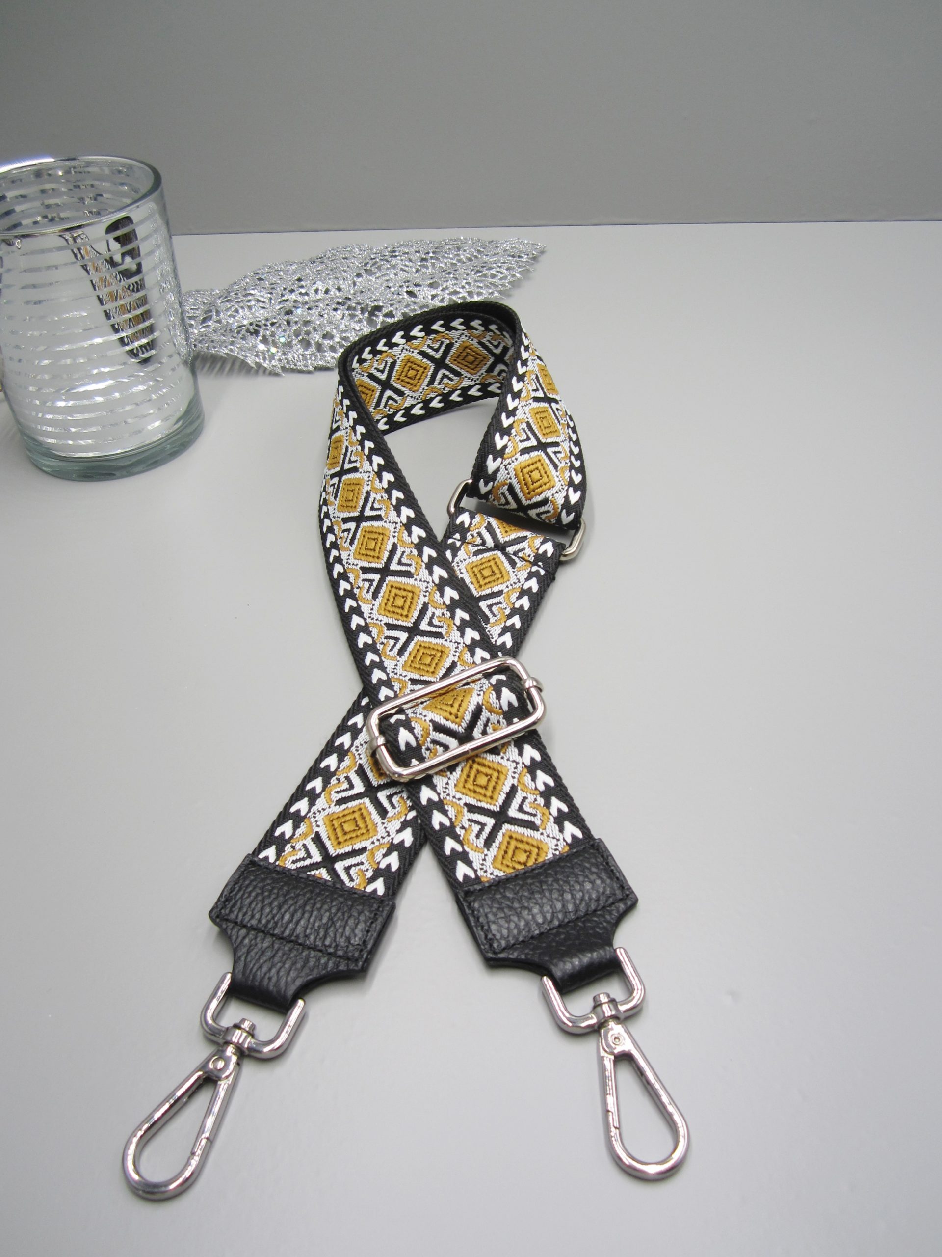 Taschengurt schwarz- Folklore Design ocker – Karabiner silber